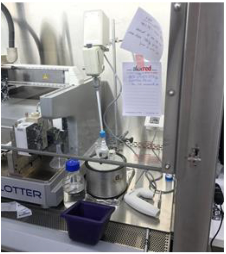 2. Spray 70% Ethanol on a cryogenic Dewar flask, an overhead mechanical stirrer, a stirrer and a stend. Insert them to the biological hood.