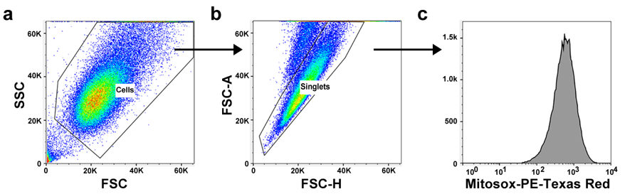 3) Plot P2 in histogram of MitoSOX Red on PE-Texas Red (Fig. c). Adjust the FACS settings for the maximum difference in MitoSOX Red signal between negative and positive controls.