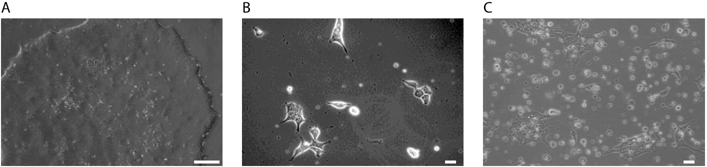 Figure 1: Selection of rtTA-Ngn2 transduced iPS cells. A: iPSCs grow as densely packed colonies before selection. Scale bar: 2.5 cm B: iPSCs 6 h after transduction with lentivirus. iPSCs were seeded as single cells. Morphological changes are possible due to virus transduction and incubation with reagents needed for the transduction, like polybrene. Scale bar: 10 µm. C: iPSCs during the selection with antibiotics. It is common to observe a lot of cell death. Selected iPSCs will grow again as densely packed colonies and need to be split when they reach 60-80% confluency. Scale bar: 10 µm.