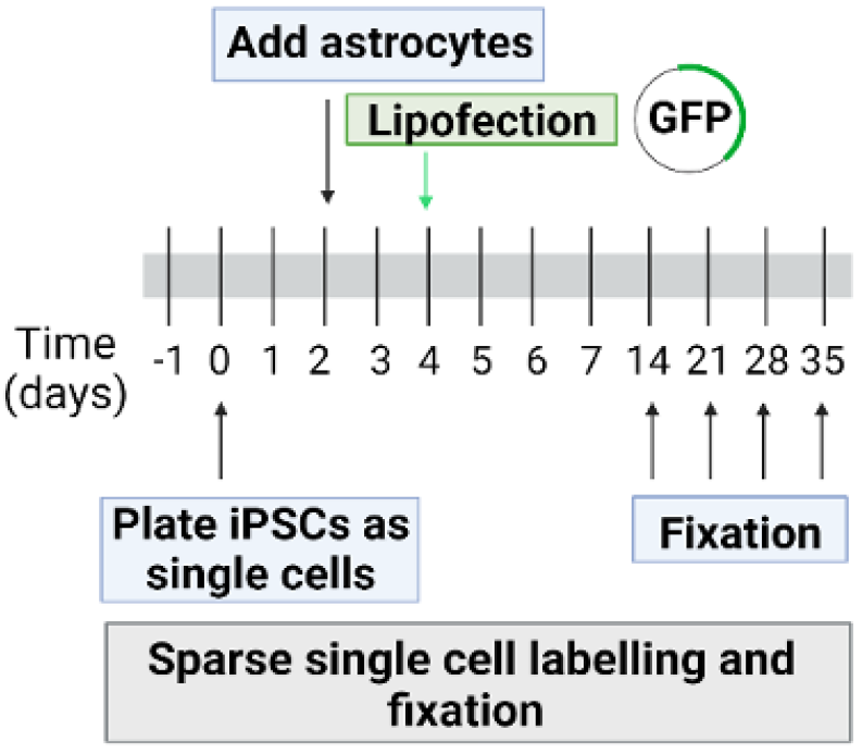 To visualize iNs soma and neurites at the single cell level, we developed a sparse labelling method for iNeurons. Plate cells on 12 mm coverslips and lipofect (transfect) them with a plasmid encoding cytoplasmic GFP (pCAGG1-GFP) at day 4 (d4) in vitro using the Lipofectamine™ 3000 Transfection Reagent (Thermofisher). The protocol used is as follows: Prepare two different mixes: lipofectamine mix, and DNA mix