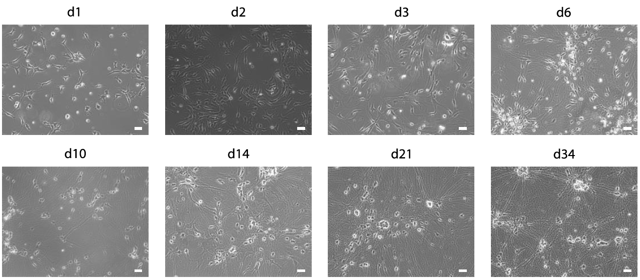 Figure 3: Differentiation of iNeurons. Phase contrast images of human iNeurons (cell line hiPS-409-B2_Ngn2) during differentiation at d1, d2, d3 (before astrocyte plating), d6 (3 days after astrocyte plating), d10, d14, d21 and d34. Scale bars: 10 µm.