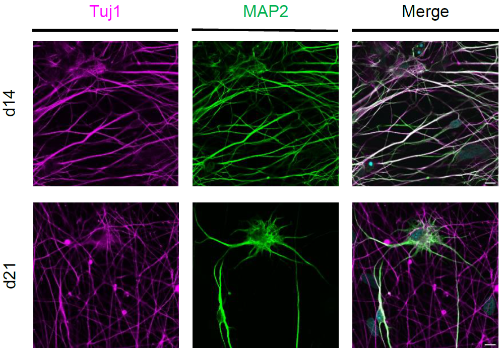 Figure 4: Characterization of iNeurons. Confocal images of human iNeurons (cell line hiPS-409-B2_Ngn2) after fixation at d14 and d21. Immunofluorescence with neuronal markers: Tuji1 (magenta) and MAP2 (green). Scale bars: 10µm.