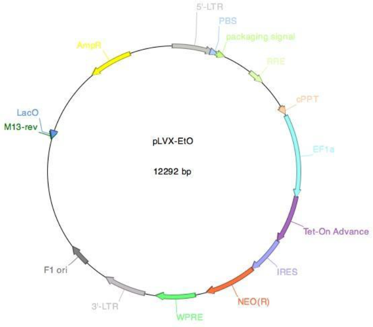 Supplementary Figure 1: Vector card for the pLVX-EtO vector. The pLVX-EtO vector (pLVX-EF1α-(Tet-On- Advanced)-IRES-G418(R)) encodes the Tet-On advanced transactivator (rtTA) for the doxycycline inducible system.