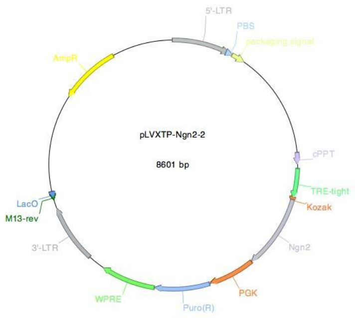 Supplementary Figure 2: Vector card for the pLVXTP-Ngn2 vector. The pLVXTP-Ngn2 vector (pLVX-(TRE- thight)-(MOUSE)Ngn2-PGK-Puromycin(R)) encodes the murine Ngn2 gene. The expression of mouse Ngn2 is controlled by the rtTA-protein bound to doxycycline in this system.