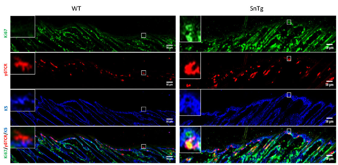 Figure 1. Visualization ofactivated DETCs in WT andSnailTransgenic skin. lmmunofluorescence assay for Ki67 (green) to depictproliferation, γδ15TCR (red) to mark DETCs and K5 (blue) to mark the basal layer ofepidermis on WT and SnTg skin section to observe the activation of DETCs. (Scale bar: 50 um)