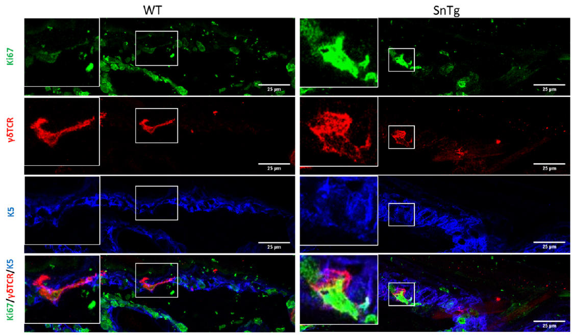 Figure 2. Morphological changes upon activation. Round morphology of DETCs marked by γδTCR (red) in Snail Tg skin shows signs of activation compared to the dendritic morphology of DETCs in WT skin. (Scale bar: 25um)