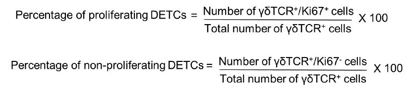 Percentage of DETCs that are Ki67 positive and negative were quantified by using ImageJ as follows: Open the merged image of γδTCR and Ki67 on ImageJ software > Main menu > Plugin > Cell counter > Initialize > Type 1. Click on the cells that are positive for both γδTCR and Ki67. This will give the number of DETCs that are proliferating. To count the number of DETCs that are negative