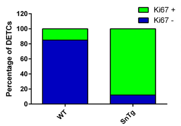 The proportion of DETCs which are Ki67 positive and negative in WT and K14 Snail Tg skin are as shown in (Figure 3).