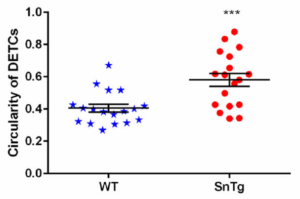 Figure 4. Quantification of morphological changes observed in DETCs. Activated DETCs show morphological changed —from dendritic to circular in shape which was quantified using ImageJ software. Scatter plot shows that DETCs in Snail transgenic epigermis are more circular (circulartity value ≥ 0.5) compared to EDTCs in WT epidermis. Data represent the values ± SEM, ***P < 0.0001, by Student's t-test.