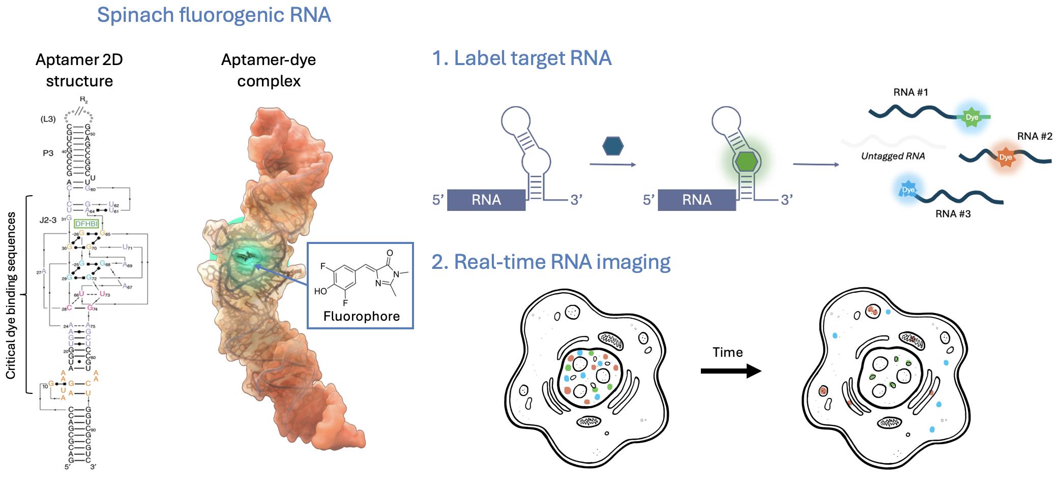 This protocol provides a focused guide to the use and applications of the SpinachTM family of fluorogenic RNA aptamers. Spinach was among the first genetically encodable RNA aptamers to enable robust fluorogenic imaging in living cells [13]. Here, we use “SpinachTM family” as an umbrella term for Spinach and related improved aptamers (e.g., Broccoli, Corn, Squash, Beetroot), together with their cognate small-molecule fluorogens (e.g., DFHBI, DFHBI-1T, DFHO, BI). These fluorophores are cell-permeable and, when bound by their matching aptamers, become highly fluorescent with minimal background in cells. In the absence of the aptamer, they exhibit little to no fluorescence, enabling high contrast. As genetically encodable tags, SpinachTM family aptamers have been widely used to interrogate RNA localization, dynamics, and regulation—both from exogenous constructs and at endogenous loci—across diverse biological and disease contexts [14–22].