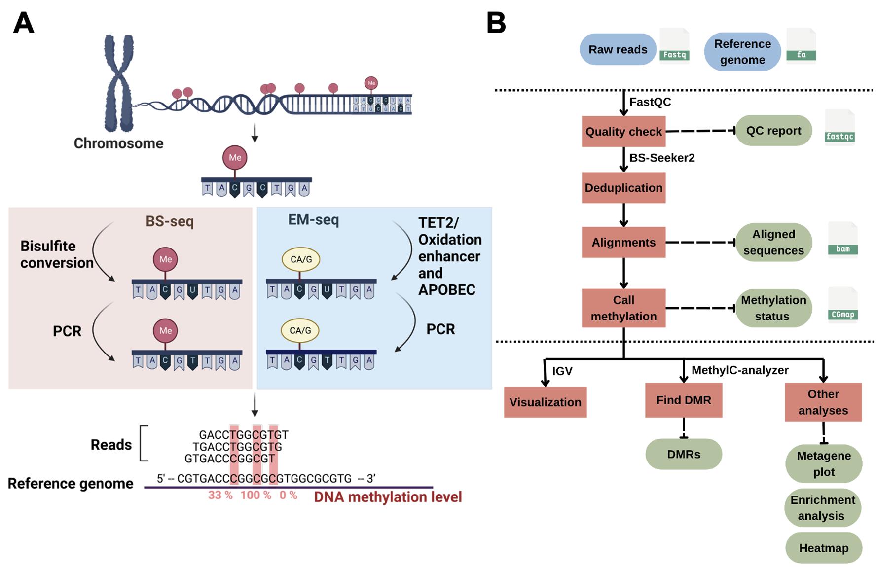 DNA methylation can silence genes or transposable elements by changing the chromatin structure or interfering with transcription factor binding [2]. Due to the importance of DNA methylation in biological processes, experimental approaches have been developed to profile genome-wide DNA methylation. Genome-wide DNA methylation profiling is commonly performed using next-generation sequencing (NGS) methods such as reduced-representation bisulfite sequencing (RRBS) [3], whole-genome bisulfite sequencing (WGBS) [4], and enzymatic methyl sequencing (EM-seq) [5]. These NGS-based approaches can determine the methylation status of DNA sequences at single-base resolution and measure DNA methylation levels digitally. In bisulfite sequencing (BS) methods such as RRBS, BS-seq, or WGBS, the crucial step is sodium bisulfite treatment, which converts unmethylated cytosine to uracil (and then to thymine during PCR), while 5mC remains unchanged (Figure 1A). Such treatment can result in approximately 84%–96% DNA degradation, causing a significant loss of DNA material and induction of sequence bias, therefore affecting the accuracy of the analyses [6]. To improve from the bisulfite treatment in BS-seq, EM-seq is performed to reduce DNA damage and produce higher-quality libraries for detecting 5mC, and it can generate comparable results using as little as 0.5 ng of input DNA compared with the 200 ng typically required for BS-seq, representing approximately a 400-fold reduction in input material. It uses two sets of enzymatic reactions, methylcytosine dioxygenase 2 (TET2) and T4-phage beta-glucosyltransferase (T4-BGT), to convert 5mC and 5hmC into products that cannot be deaminated by apolipoprotein B mRNA editing enzyme catalytic subunit 3A (APOBEC3A). Then, APOBEC3A deaminates unmodified C to generate U, which is eventually converted into T during PCR (Figure 1A) before the final library is sequenced. Compared to BS-seq, EM-seq offers a higher yield and better genome coverage with fewer PCR cycles required [7]. Unlike bisulfite libraries, EM-seq libraries do not exhibit biased AT-rich, GC-poor sequence representation due to the absence of bisulfite treatment–induced DNA damage [5]. Moreover, low-input EM-seq libraries provide similar results to high-input libraries; for instance, a 0.5 ng input of EM-seq covers more CpGs (regions of DNA where a cytosine is followed by a guanine) than the 200 ng input used in BS-seq, highlighting the higher sensitivity of EM-seq [5].