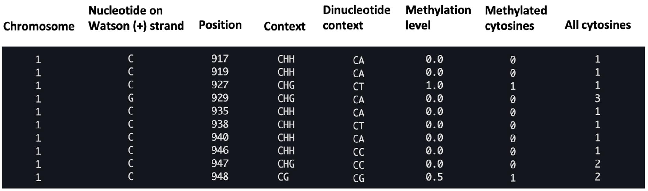 Figure 2. Example of a CGmap file generated with the BS-seeker2 call methylation script. The figure displays a screenshot of the ten rows from the “wt_r1.CGmap.gz” file.
