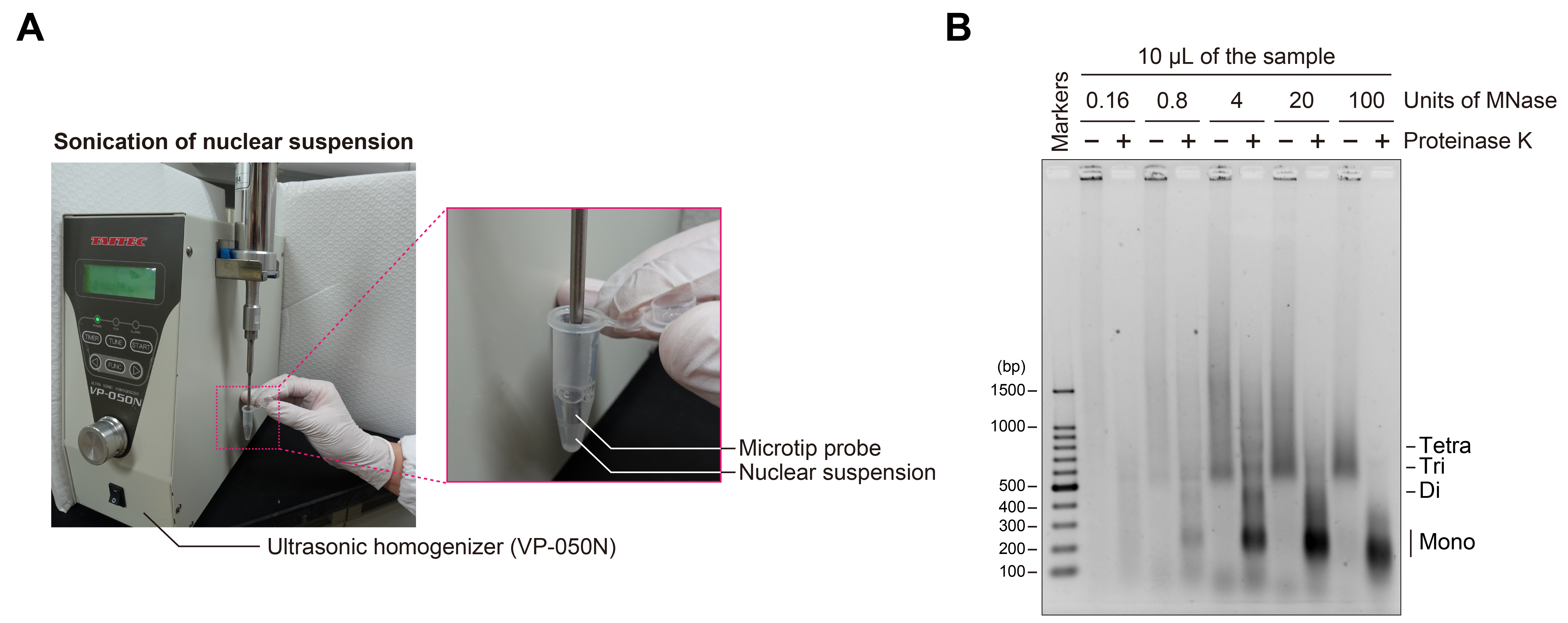 16. Sonicate the nuclear suspension using a VP-050N ultrasonic homogenizer (TAITEC) equipped with a microtip (2 mm in diameter) under the following conditions: PWM = 20%, 3 s on/7 s off, for 6 cycles (Figure 1A).