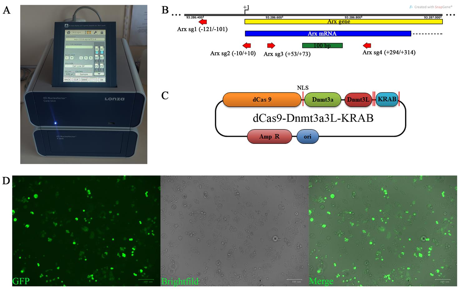 1. The Arx gene DNA sequences with NCBI ref. s. NC_000086.7 [assembly: GRCm38.p6 (GCF_000001635.26)] were obtained using the UCSC Genome Browser [12]. Potential binding sites for sgRNAs targeting the dCas9-3a3L-KRAB fusion protein to the Arx promoter were designed by the online E-CRISP platform [13]. The sgRNAs were chosen to target the Arx promoter region and CpG island, with a focus on high efficiency and low off-target effects (Figure 1B).