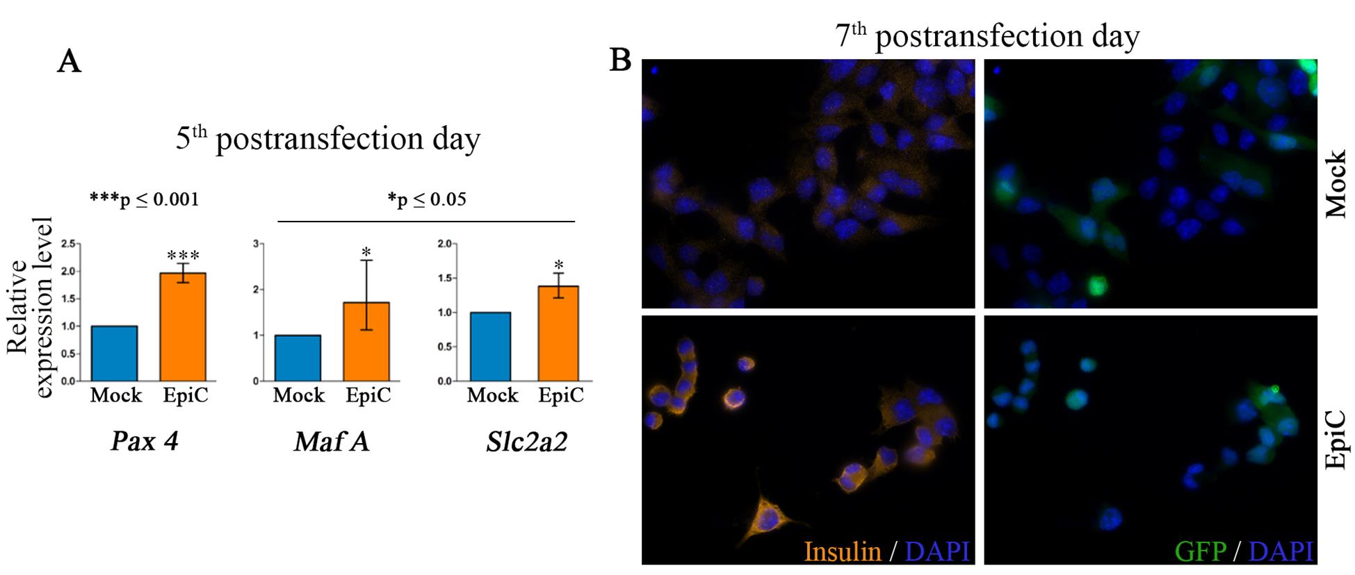 In summary, this approach for cell transdifferentiation involves precise epigenetic editing of a lineage-specific marker gene, thereby enabling direct lineage conversion in a safe and versatile strategy to generate insulin-producing cells by epigenetic reprogramming. In contrast to approaches that rely on viral vectors or permanent genome editing, this method reduces the risk of off-target effects and immunogenic responses while ensuring reproducibility. The combination of efficiency and precision makes it a valuable tool to advance regenerative approaches for diabetes therapy and to explore the epigenetic regulation of cell identity.