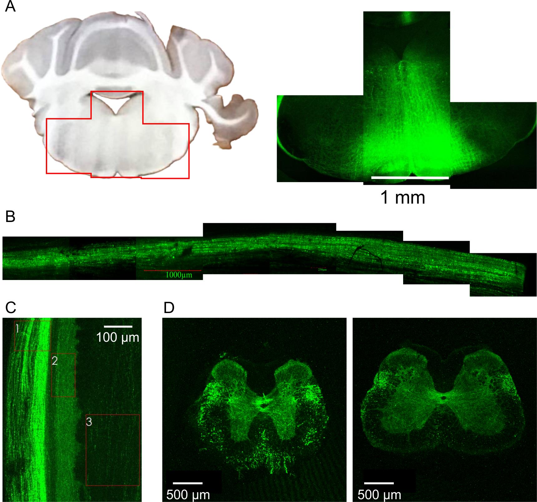 Figure 14. EGFP expression patterns after stereotaxic injection of the respective viral construct into the rostral ventromedial medulla (RVM). (A) Expression of EGFP within the RVM. (B) EGFP fluorescent signal from the dorsolateral funiculus of the spinal cord. (C, D) EGFP expression pattern in the spinal cord. (C) Lateral view of the spinal cord. 1: dorsolateral funiculus; 2: lamina I; 3: dorsal column. (D) Coronal sections showing EGFP fluorescence in the thoracic (left) and lumbar (right) segments. Notice that the highest intensity of EGFP signal is observed for the dorsolateral funiculus, superficial dorsal horn (lamina I–II), and the area around the central canal (lamina X).