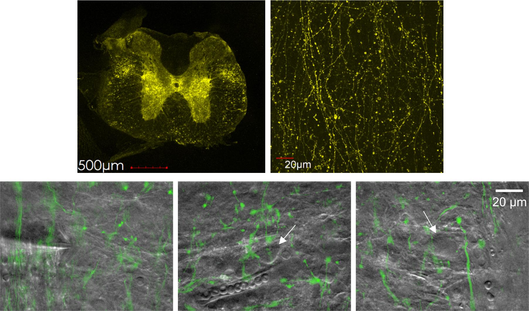 Figure 15. Channelrhodopsin-2 (ChR2)–EYFP expression pattern in the spinal cord. Top row: Confocal images showing ChR2–EYFP expression in the spinal cord (left) and in spinal lamina I (right). Bottom row: infrared (IR)-LED oblique illumination images (gray) overlaid with epifluorescent ChR2–EYFP images (green), revealing rostral ventromedial medulla (RVM)-originating fibers and en passant boutons. White arrows indicate somata of lamina I neurons. Notice a patched neuron in the left image.
