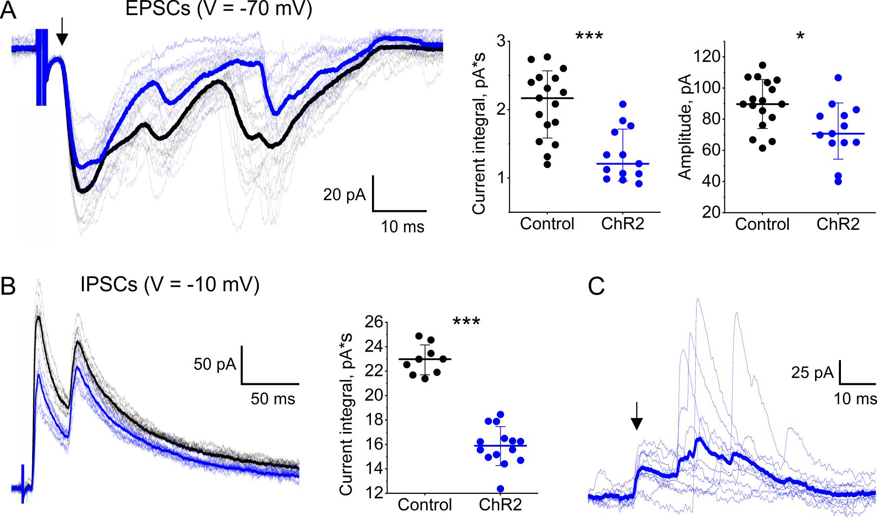 Figure 16. Effects of channelrhodopsin-2 (ChR2) photostimulation of rostral ventromedial medulla (RVM) fibers on synaptic activity of lamina I neurons. (A, B) ChR2 photostimulation-induced reduction of primary afferent–driven postsynaptic currents. (A) Left: Patch-clamp recordings of excitatory postsynaptic currents (EPSCs) evoked by electrical dorsal root stimulation. Black traces: no photostimulation. Blue traces: continuous (5 Hz, 10 ms pulses) ChR2 photostimulation. Thick curves: averaged traces. The arrow indicates A-fiber-driven monosynaptic component of primary afferent input. Effects of ChR2 photostimulation on the EPSC integral (middle) and on the amplitude of the monosynaptic component (right). (B) Left: Patch-clamp recordings of inhibitory postsynaptic currents (IPSCs) evoked by electrical dorsal root stimulation. Black traces: no photostimulation. Blue traces: continuous ChR2 photostimulation (5 Hz, 10 ms pulses). Thick curves: averaged traces. Right: Effect of ChR2 photostimulation on the IPSC integral. (C) Postsynaptic inhibitory currents elicited in response to 10 consecutive light pulses. Blue traces: individual IPSCs evoked by ChR2 photostimulation of RVM fibers. Thick blue curve: an averaged trace. An arrow indicates a presumable monosynaptic component of IPSCs. *p < 0.05, ***p < 0.001, Mann–Whittney test.
