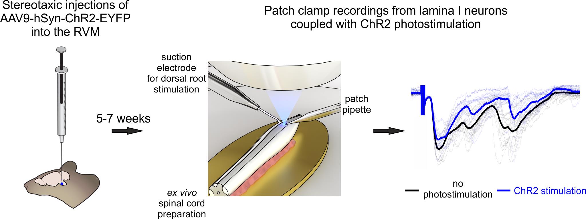 Unfortunately, descending modulation remains poorly studied due to technical challenges that arise from the intrinsic organization of the central nervous system. Spinal and supraspinal structures are spatially separated (even in mice, they are a few centimeters apart), making it difficult to preserve both for functional studies. To address this challenge, several different approaches have been developed. The first one involves single-unit recordings from spinal neurons coupled with electrical stimulations of brainstem regions [6–8]. Although this method provides valuable information on how descending regulation affects action potential generation in spinal neurons, it offers no insight into its cellular and synaptic mechanisms. Besides, this method is difficult to apply to lamina I, as it is an extremely thin layer extending only about 30 μm from the surface of the dorsal horn. The second approach involves patch-clamp recordings in ex vivo spinal cord preparation combined with electrical stimulations of various descending spinal cord tracts [9]. While this technique is more suited for mechanistic studies, it cannot distinguish the impact of individual supraspinal structures, as their fibers largely travel within the same dorsolateral funiculus. Lastly, the third approach relies on optogenetics, i.e., virally mediated expression of light-sensitive channelrhodopsin-2 protein in the axons and terminals of descending fibers [10]. Combining patch-clamp recordings from superficial dorsal horn neurons with selective, photostimulation-induced activation of descending fibers originating from a single supraspinal source offers a unique possibility to determine how specific brain structures exert descending control. However, this method requires slicing the spinal cord, which damages lamina I and compromises primary afferent input—an important limitation, as descending fibers are known to modulate synaptic transmission between primary nociceptors and spinal neurons through presynaptic mechanisms.