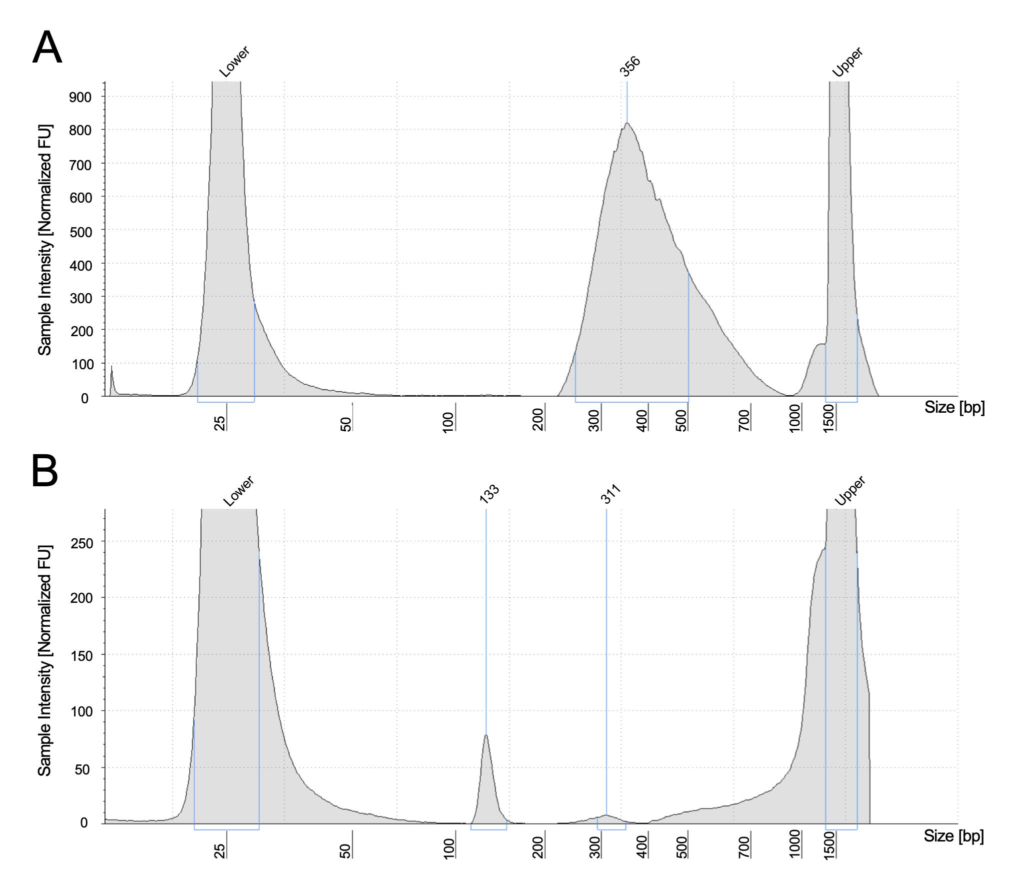 Figure 1. Example of TapeStation profiles. (A) The ideal library size, together with the adapter, is around 300–400 bp. (B) A failed profile shows only an adapter dimer around 130 bp.