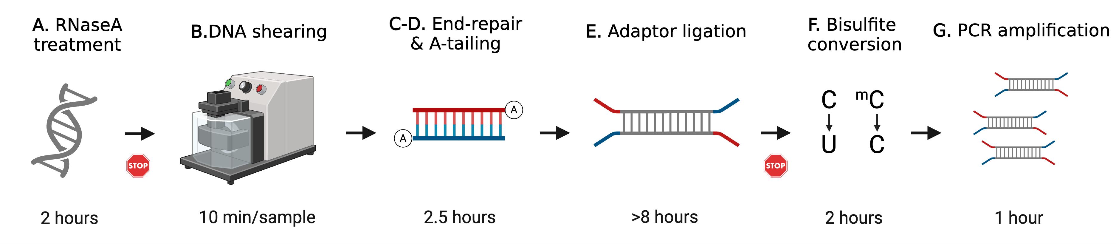 Schematic overview of whole genome bisulfite sequencing (WGBS) library preparation. This protocol describes step-by-step WGBS library preparation. Starting from genomic DNA (gDNA), RNaseA treatment removes excessive RNA. gDNA is then fragmented by ultrasonication. End-repair and A-tailing allow DNA fragment ends to be modified for adapter ligation. After a few cycles of PCR amplification, the final WGBS library is then quantified and verified for concentration and size distribution. The STOP signs represent safe stop points.