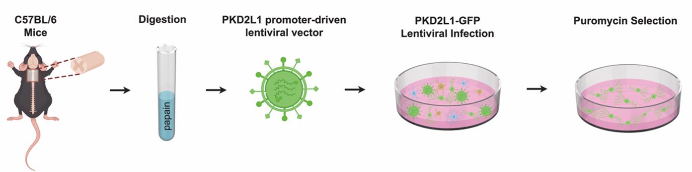 In this study, we developed a lentiviral system driven by the mouse PKD2L1 promoter for efficient in vitro selection of CSF-cNs. This system incorporates dual reporter elements—green fluorescent protein (GFP) and puromycin resistance gene (PuroR)—enabling both fluorescence-based tracing and antibiotic-based selection. By infecting primary spinal cord cells with the virus, followed by puromycin selection and enrichment of GFP-positive cells, we obtained a high-purity CSF-cNs population. This system enables the acquisition of highly purified CSF-cNs under controlled conditions, thereby facilitating targeted interventions and pathway analyses, and providing a reliable platform for functional and mechanistic studies in vitro.