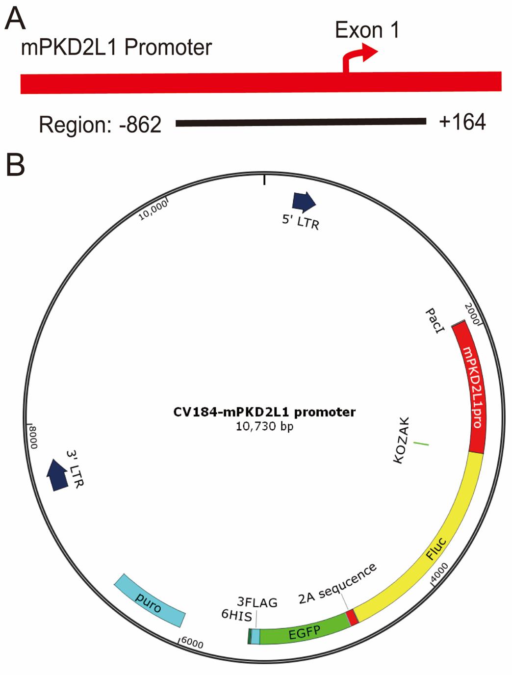 1. Promoter fragment selection: We selected the -862/+164 fragment (1,026 bp in total) as the PKD2L1 promoter, following the common strategy of including approximately 1 kb of upstream promoter sequence and a short overlap with the non-coding portion of Exon 1 to cover the core promoter and proximal regulatory elements. Its specificity was further verified by BLAST against the mouse genome.