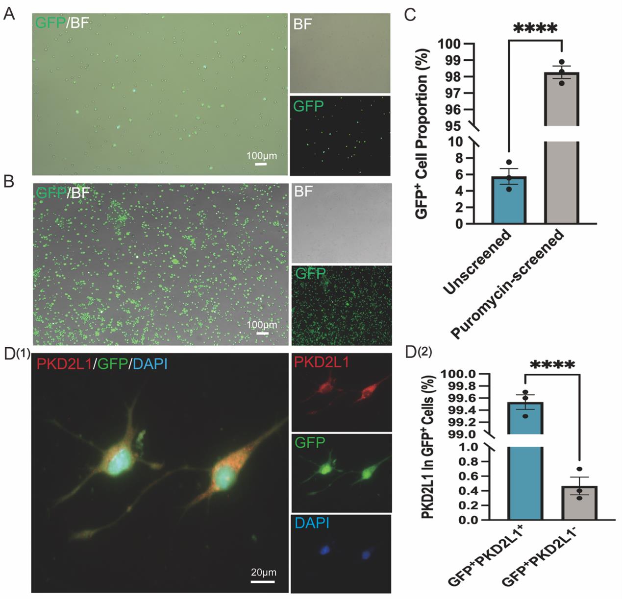 • Combines GFP-based fluorescence tracing and puromycin selection for efficient dual-mode enrichment of high-purity CSF-cNs.