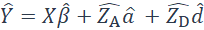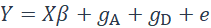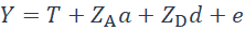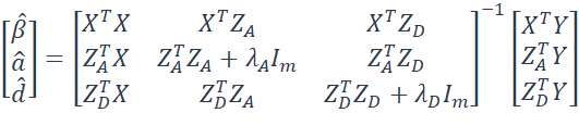 5. Solve the model Y=T+ZAa+ZDd+e, while, Y is the across experiment series BLUEs, đ is a fixed effects type of genotype (either lines or hybrids), is the additive marker effect, e is the dominance marker effect, and e is the residual.