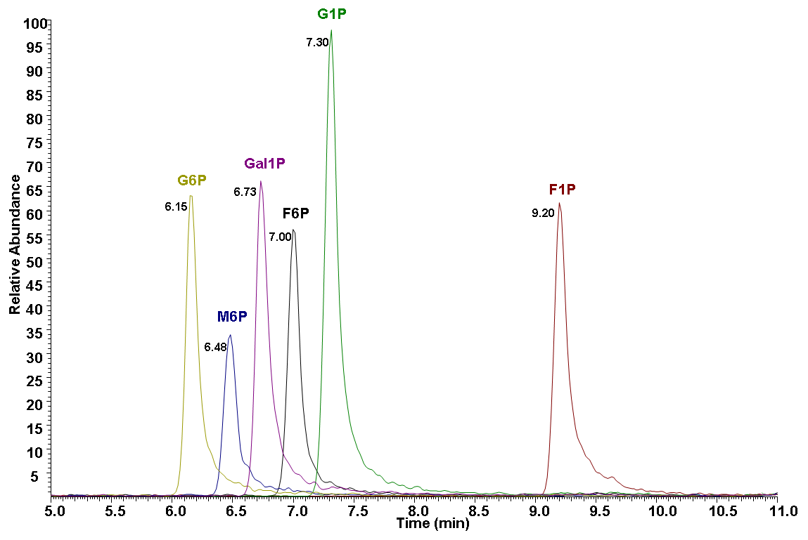 Keywords: Hexose phosphates, Isomers, LC-MS, Glucose-6-phosphate, Fructose-6-phosphate, Glucose-1-phosphate, Fructose-1-phosphate, Galactose-1-phosphate, Mannose-6-phosphate