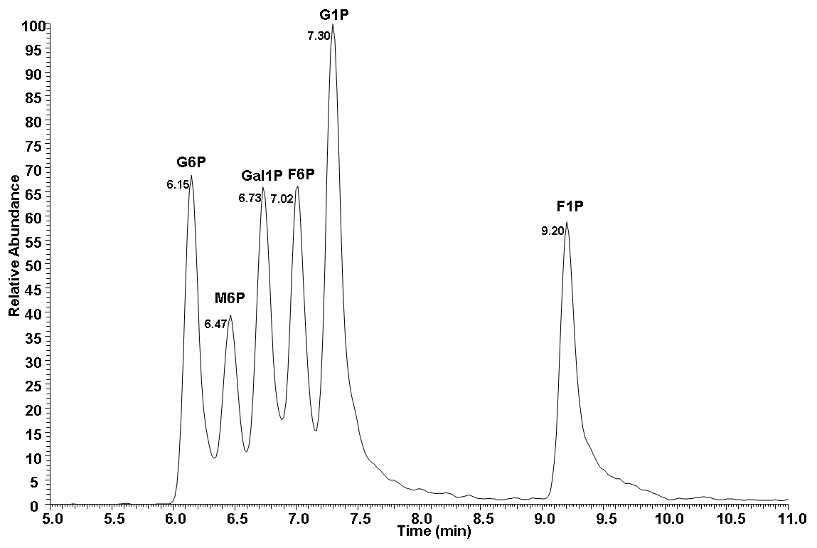 Chromatographic peak areas for G6P, F6P, M6P, G1P, F1P and Gal1P are integrated using Xcalibur