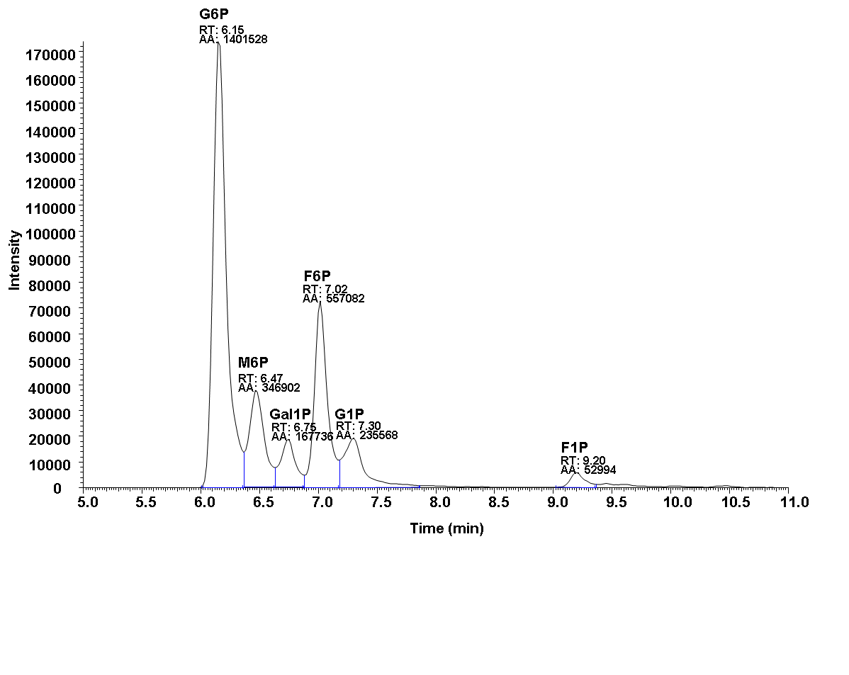 [Background] Hexose phosphates are key intermediates in many biosynthesis pathways including glycolysis, glycogenolysis, oxidative pentose phosphate pathway and so on. The isomeric hexose phosphates are interconvertible through enzymatic reaction, but each of them plays a unqiue role in organism. For example, the interconverstion of glucose-6-phosphate and glucose-1-phsophate is mediated by phosphoglucomutase in glycogenolysis (Adeva-Andany et al., 2016). The dysregulation of hexose-phosphate metabolism is strongly correlated with various diseases. Galactose-1-phosphate uridyltransferase (GALT) deficiency, which leads to elevated galactose-1-phosphate (Gal1P) in patients, is the most common cause of galactosemia. The concentration of Gal1P in erythrocytes is also a sensitive index of dietary control (Timson., 2019). Modification of mannose 6-phosphate is a well-characterized sorting signal for lysosomal enzymes (Kornfeld., 1986; Von Figura et al., 1986). Therefore, establishing a reliable approach to quantitively analyze isomeric hexose phosphates is of key importance to further investigate these metabolic disorders.