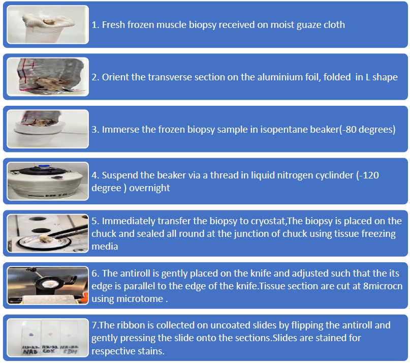 Enzyme histochemistry is an important diagnostic technique which is based on metabolism of a substrate provided to tissue enzyme in its orthotopic site. 1It complements standard morphological studies in histopathology2 and is indispensible in assessing the muscle biopsies of patients suffering from neuromuscular disorders .All steps in standard processing procedures, from formalin fixation to wax embedding, contribute to the loss of enzyme activity. In order to maintain the activity of enzymes , fixation and wax embedding should be avoided completely .Freeze drying maintains the tissue components , particularly the enzymes in their native state and are necessary for enzyme histochemistry .
