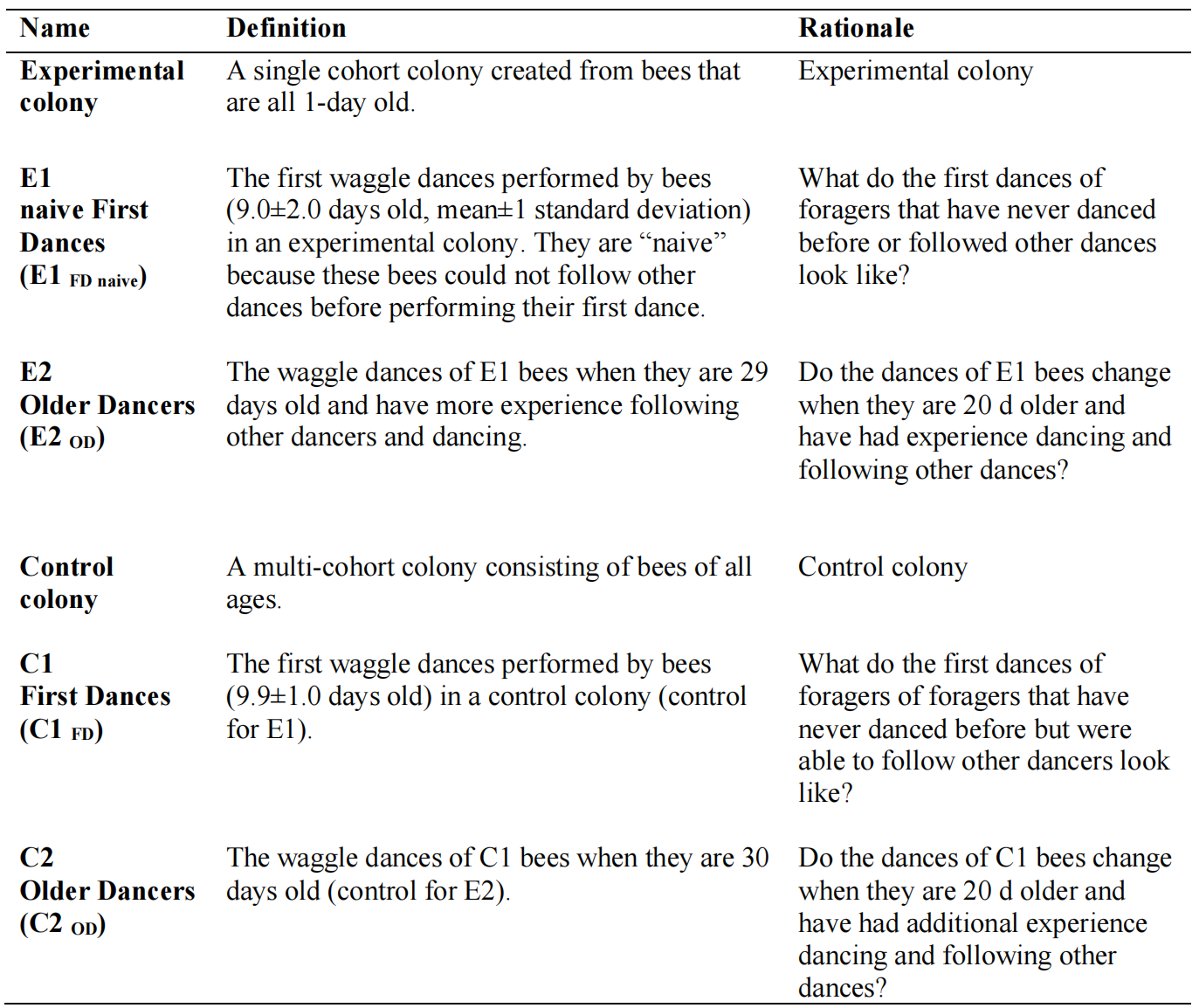 Table 1. Definitions of the different colonies and bee types. The rationale explains the main reason for observing the dances at each stage.