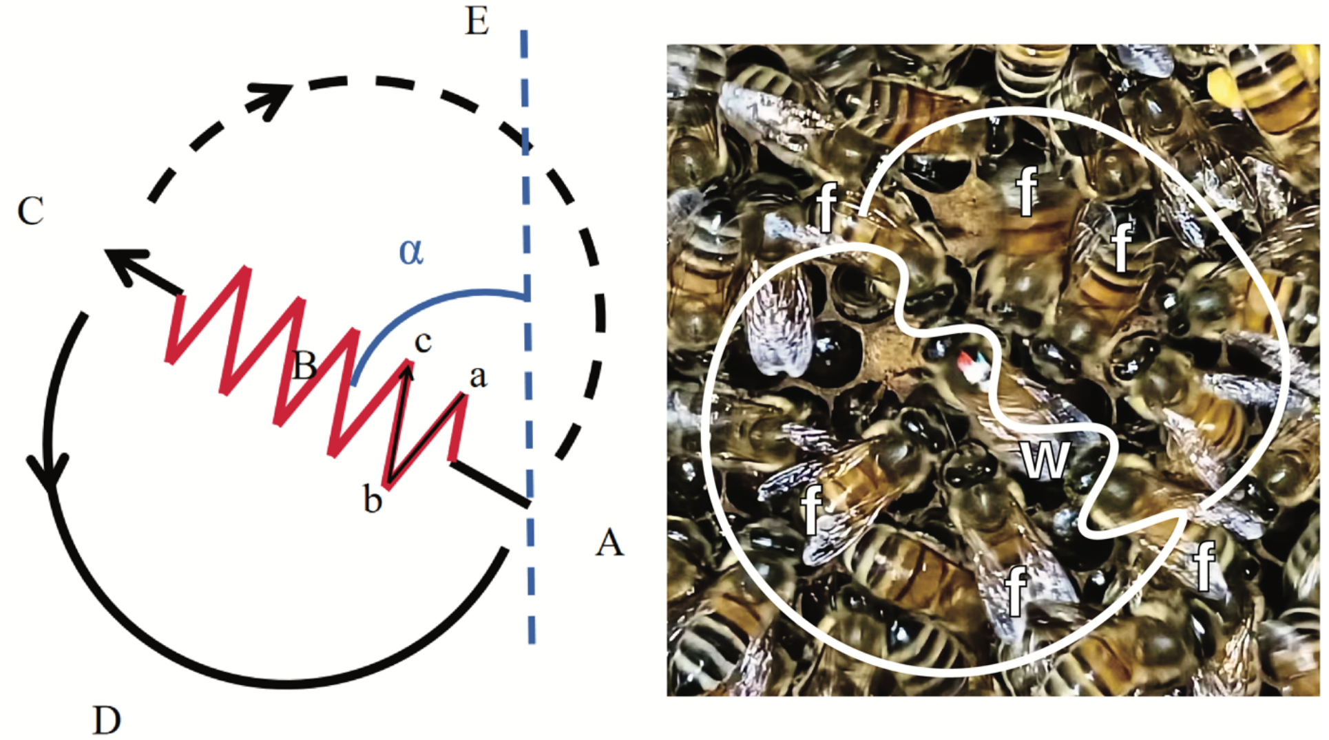 Figure 1. Diagram illustrating waggle dance measurements. A photo of a waggle dancing bee (w) surrounded by dance followers (f) is shown for context. The angle (α) of the waggle run is the angle between the waggle direction and the vertical dashed blue line (defined by gravity on a vertical comb). This waggle angle communicates the direction of the food source from the colony relative to the sun' s azimuth at the time of the dance. For example, if a food source is in the direction of the sun, the waggle run points straight up. If a food source is in the direction opposite the sun, the waggle run points straight down. In this example, α = 45° to the left of the vertical line and thus the food source is located 45° to the left of the sun' s azimuth. The waggle run consists of waggling motions of the abdomen made as the bee traverses a line crossing three points: A-B-C. The waggle duration is measured from point A to point C. Each waggle is defined by the abdominal tip moving from points a-b-c. (one peak-to-peak cycle). The return phase duration is measured as the time it takes a bee to return from a completed waggle run and is shown by the curve C-D-A or the curve C-E-A. In a fully ordered waggle dance, the dancer typically turns in the opposite direction on each repetition. For example, if the dancer traverses C-D-A, on the next return phase, it will likely follow the path C-E-A on the next turn phase.