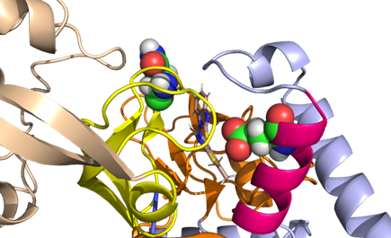 Within MOE, SiteFinder was used to identify potential binding sites from the whole protein. Briefly, a global search for possible binding sites based on a geometric method utilizing a version of convex hulls that does not require calculation of interaction energies or protonation states was used to locate putative inhibitor binding sites (80).