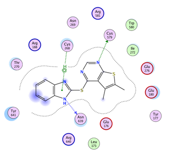 Within MOE, based on a ranked list of Propensity for Ligand Binding (PLB) scores > 0.5 and locations of putative binding domains that were not situated is disordered regions, calculated binding energies were calculated for the 4 thienopyrimidines. First, random poses are generated for each ligand and evaluated using a London dG scoring function. Next, the poses are refined using the GBVI/WSA dG Scoring function. The Amber14 : EHT (Extended Hueckel Theory) force field was used to approximate the potential energy of the molecular system (92). A video briefly describing this tool can be found through MOE’s commercial website: https://video.chemcomp.com/watch/2VtMGBYvvMkumZqo8A3yJN?second=268&autoplay=1. Small molecule ligand Docking was performed in MOE using the Dock (docking) interface which can be seen on https://video.chemcomp.com/watch/6dGEChdi82ZfRr1XrV1JrY?second=537&autoplay=1.